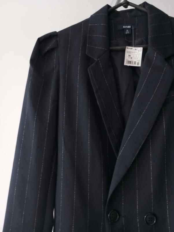 Идеальный женский пиджак Kiabi. Цвет: темно-синий, с тонкими серебряными полосками. Очень нарядный. Состояние: новый, с биркой. Размер: М