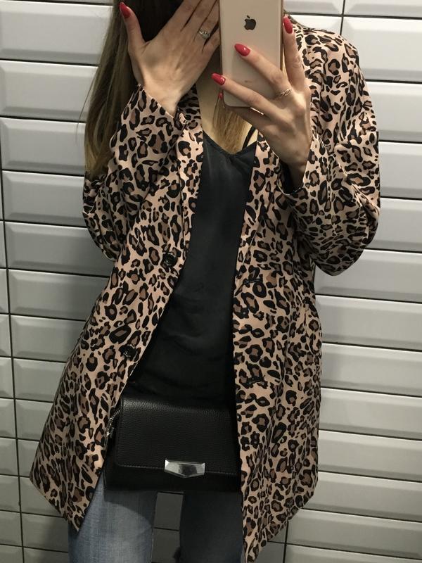 Леопардовый жакет-пальто в отличном состоянии Ткань очень плотная, гладкая Застёгивается спереди на 2 пуговицы Есть карманы по бокам 97% полиэстер, 3% эластан Размер указан S, идет на S-M Мой рост 168см Длина 80см Ширина 55см Длина рукава от плеча 57см Есть маленький нюанс внутри возле петельки (смотрите последнее фото)