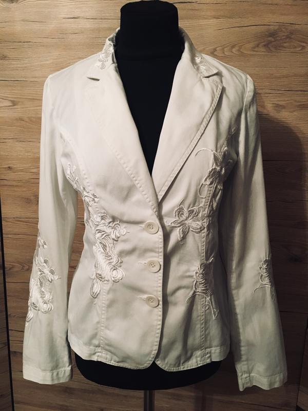 Элегантный и богатый жакет. Цвет белоснежный. Красивая асимметричная вышивка гладью. Без дефектов. Без подкладки, без карманов. Приталенный силуэт. Ткань плотная, но не тяжелая (100% котон). Замеры в груди 48 см в талии 43 см в бёдрах 49 см длина 59 см рукав 61 см в плечах 40 см . Состав: Полиестер 65% вискоза 35% Предоплата на карточку Приват банк. Пересылка после оплаты Новая почта. Возврата нет. Делайте покупки обдуманно.