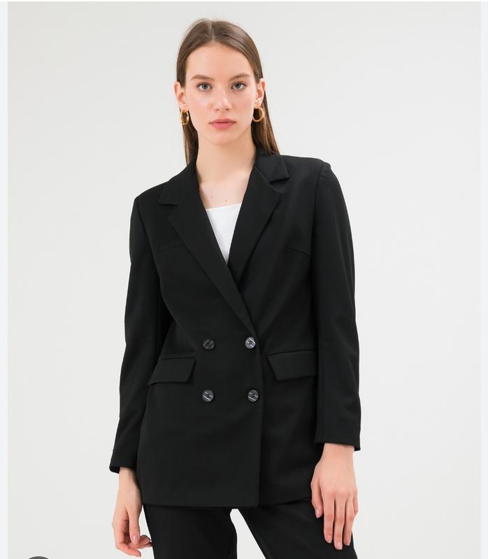 Двубортый женский жакет р. М-L, состояние отличное, цвет насыщенный черный, красиво садится по фигуре длина 69 ширина под руками 50 талия 45 плечи 43 рукав 61