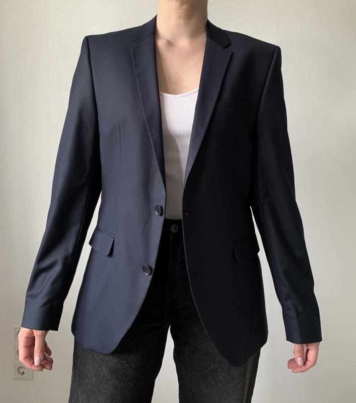 Піджак темно-синього кольору з чоловічого плеча На розмір М У складі 35% віскоза, 65% поліестер Довжина 72 см, ширина плеч 45 см, довжина рукава 66 см, напівобхват грудей 52 см Стан ідеал