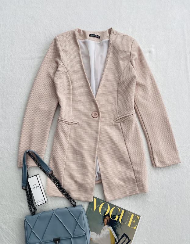 Піджак бежевого кольору,подовженої моделі,без коміра,застібається на 1 гудзик.Тканина в рубчик.Розмір S.