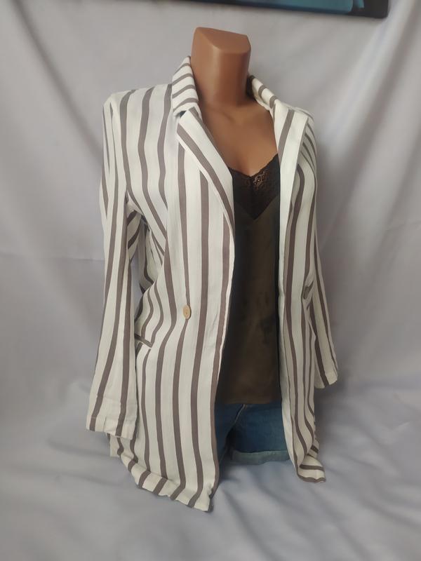 Легкий пиджак без подкладки. Рукав регулируется. Без застежки. Материал: 67% хлопок, 33% вискозы. Размер М. Замеры: ширина в плечах 38см, пог 47см, пот 44см, пос 46см, рукав 55см, длина 74см.