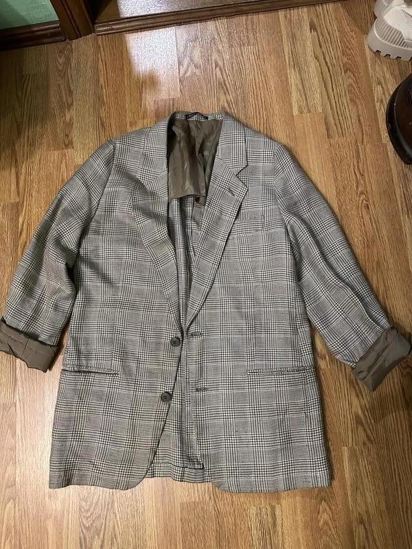 Трендовый шерстяной пиджак в стиле с мужского плеча. Отвернутые рукава с манжетом придают шарму образу. Бежевый тонкий шерстяной материал, красиво держит форму, без подкладки. Три кармана.