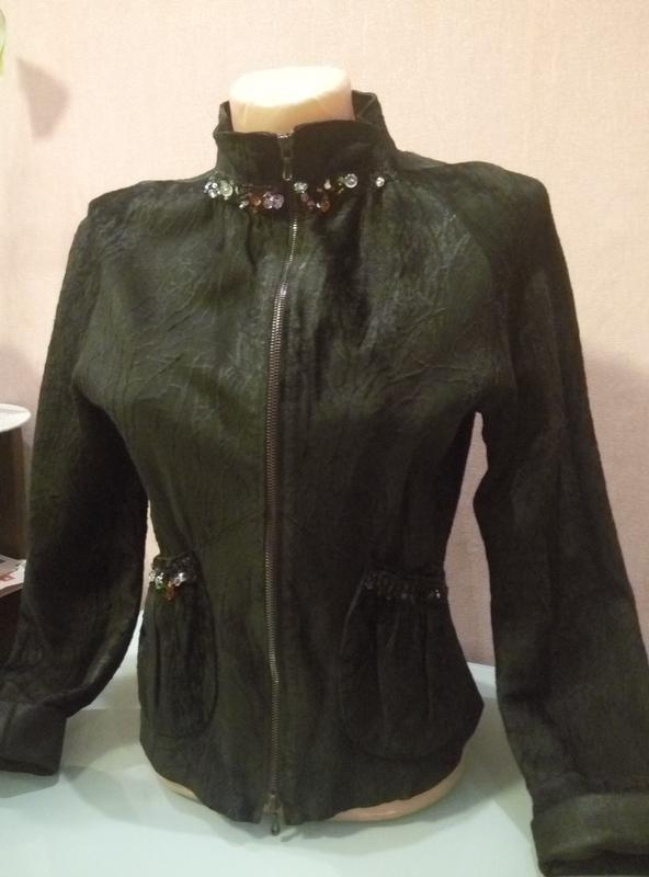 Стильний жіночий піджак з натуральної шкіри турецької фірми Harmanli. Оздоблений камінцями, стан хороший. Довжина виробу 52 см. Рукав реглан.