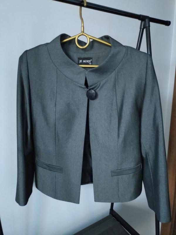 Продам укорочений жакет на одному великому ґудзику з коміром стійкою. Італійська якість, стан ідеальний. Металізована сріблясто-чорна тканина.