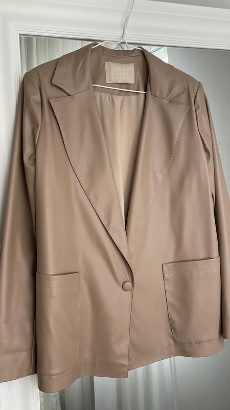Очень красивый. Качественный пиджак. На подкладке. Эко кожа мягкая, выглядит как натуральная кожа. Оттенок - беж. Идеальное состояние. Длина 70 см Рукав от плеча 65 см ПО 50 см
