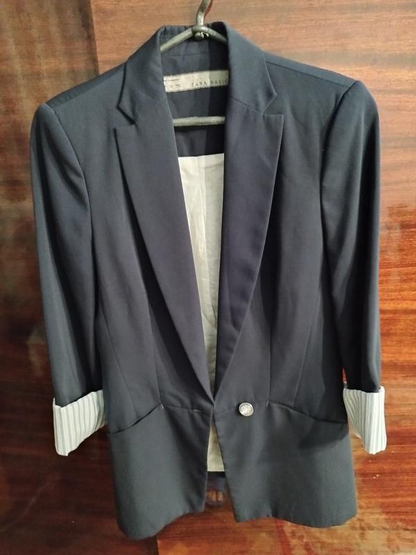 Піджак, темно-синього кольору, рукави закочуються в 3/4 і можуть бути звичайної довжини