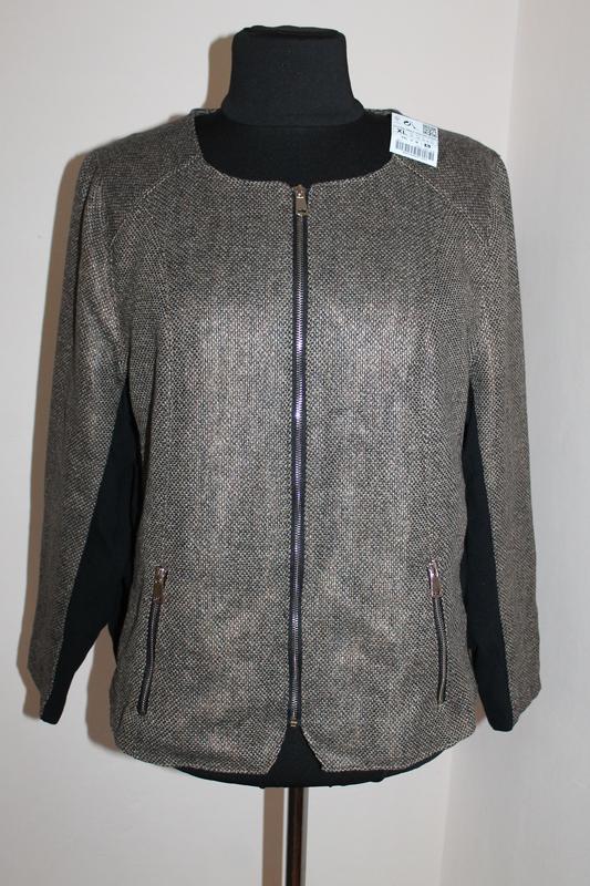 Класна річ відомого голандського бренду прислана з Європи,розмір ХЛ-52. Складники : 65%-віскоза, 30%-нейлон, 5%-еластан.Тканина має легкий перламутр зовні .Довжина-57см, плечі-46см, рукав від плеча-62см, пог-64см, пот-61см, поб-65см.