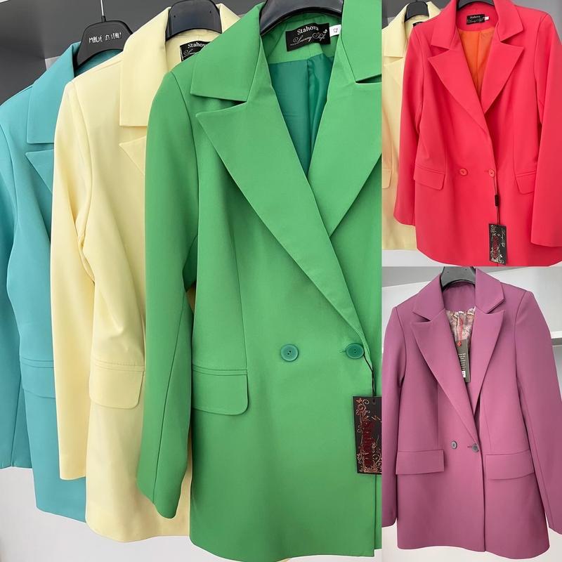 Ціна 450грн🔥🔥🔥 Якісні піджаки на підкладці Зелений - 42, 46💚 Рожевий - 42🩷 Фіолетовий - 42, 44, 46, 48💜 Голубий - 46 Лимонний - 44, 46💛 42: пог 44, рукав 61, довжина 70 44: пог 46, рукав 61, довжина 71 46: пог 48, рукав 61, довжина 72 48: пог 50, рукав 61, довжина 73см