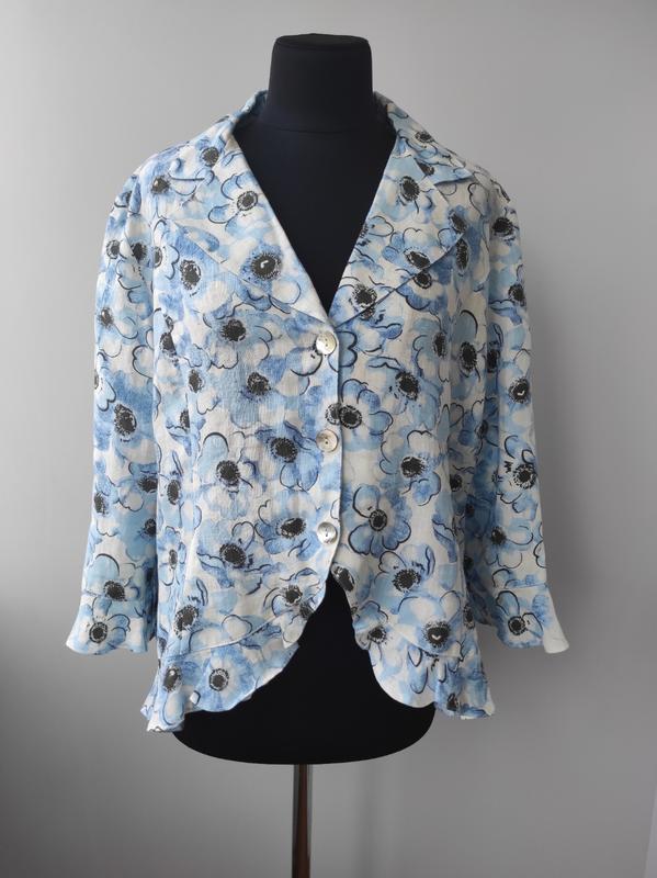 Льняной 100 % лен жакет 22 р от rowland's Размер - 22 Цвет - белый основной, голубой цветочный аринт Материал - полотно 100 % лен Без подкладки Застежка - пуговицы Длина по спинке - 63 см, пог - 60 см, пот - 56 см, низ - 68 см, рукав - 50 см, плече - 14 см.