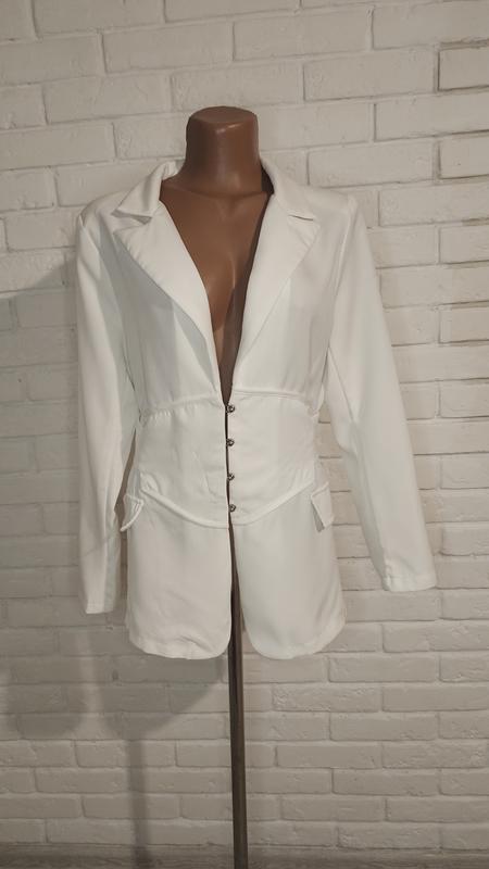 Стильный белый пиджак с имитацией корсета на талии, длинный рукав, длина ниже бедер в идеальном состоянии. Замеры НПО груди 47 см, НПО талии 39 см., НПО бедер 49 см., длина рукава 60 см., длина пиджака 70 см.