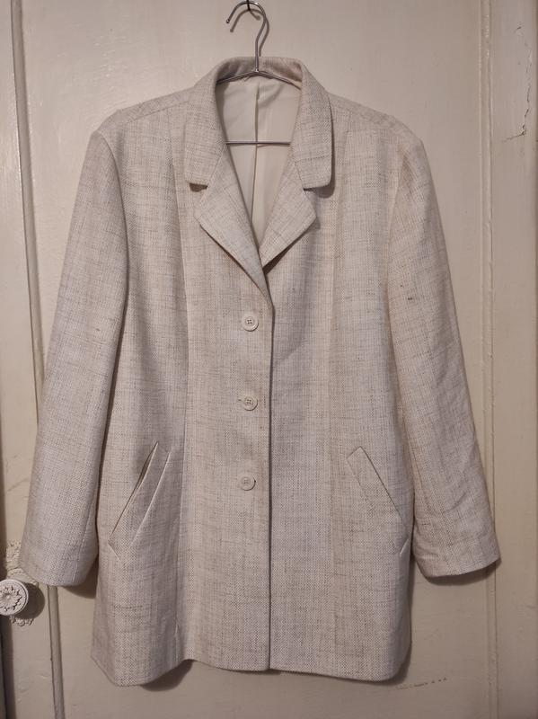 Жакет женский прямого фасона Canda В идеальном состоянии 👌 на подкладке Размер L 50% полиестру, 40% вискоза, 10% лён Цвет айвори, пуговицы в цвет жакета 😍 Плечи 46 Длина рукава 59 Полуобъем груди и низа 62 Длина прорези по бокам 17 Длина 77