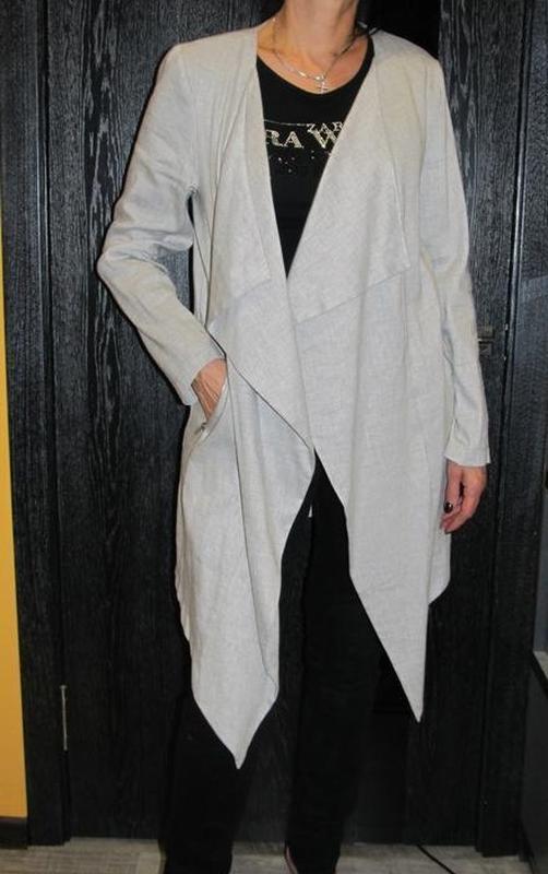 Длинный жакет "пыльвик" от New Look р. 14 Оригинальный крой, свободные полы, без застежки, карманы на молнии, натуральная ткань-55% лен,28% полиэстер, 14% вискоза, 3% эластан. ЗАМЕРЫ: Длина по спинке-87см, пог 53см. поб-55см рукав 63см. Новое.
