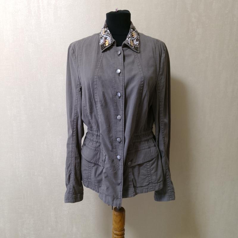 Дело в идеальном состоянии, очень классного бренда. Очень интересная куртка жакет, можно носить в различных вариантах, воротник украшен бусинами и стразами можно отстегнуть и вещь превращается из нарядной в повседневную спортивную! В обратной части есть шнурок которым можно регулировать талию. В составе лиоцелл, коттон и лён, очень приятная на ощупь. Замеры: длина 64 см, по груди 100 см, талия 96 см.