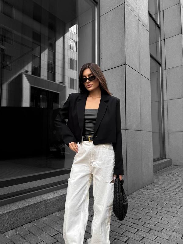 пиджак ▪️мод 21 ▪️ткань: костюмка премиум качества + подклад ▪️цвет: черный ▪️SM / ML Укороченный пиджак свободного кроя, выполненный из костюмки премиум качества + подклад На кнопочках ; Идеально садится по фигуре 👌 ФОТО РЕАЛ Длина изделия 45 см | Размер SМ| Обхват грудей: 80-87 см Обхват таліі :60-66 см Обхват Стегон : 89-95 см | Размер ML | Обхват груди: 87-94 см Обхват талии : 67-73 см Обхват стегон : 95 -100 см Топ на фото мод 353 23