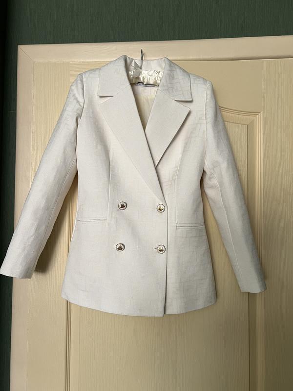 Пиджак из жаккарда двубортный Пиджак блейзер молочного цвета из жаккарда Фэнди, пошит в ателье, ручная работа. Очень приятная фактура, материал верха - хлопок. Силует приталений. Швы идеальны. Пиджак совершенно новый, ни разу не надевался. Ширина по плечах: 38 см Ширина по грудях: 46 см Ширина по талии: 40 см Ширина по стегнах: 48 см Длина от плеча: 67 см Длина рукава: 59 см