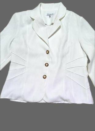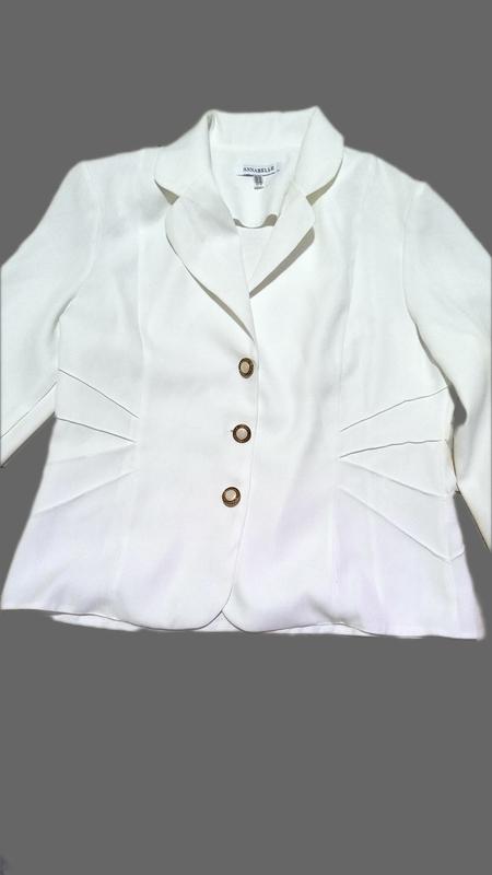 Жакет женский белого цвета размера EU 42. Замеры: Полуобхват груди-50см Полуобхват талии-46см Полуобхват бедер-52см Дл. по спине-60см Дл. рукава-60см Нуждает стирку