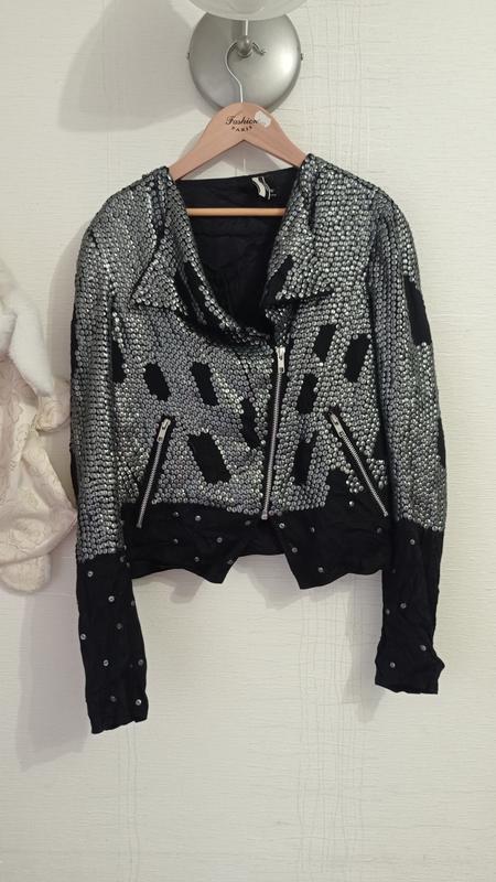 Очень интересная дизайнерская вещь. Вискоза, вся расшитая пайетками, которые имеют блеск, но скорее металла, не дешевый бутафорский. Как будто, расшита металлическими клепками. Состояние новой вещи, никаких недостатков. Приятная тактильно, на фигуре смотрится бомбезно. Качественные металлические молнии. Размер - 8, S.