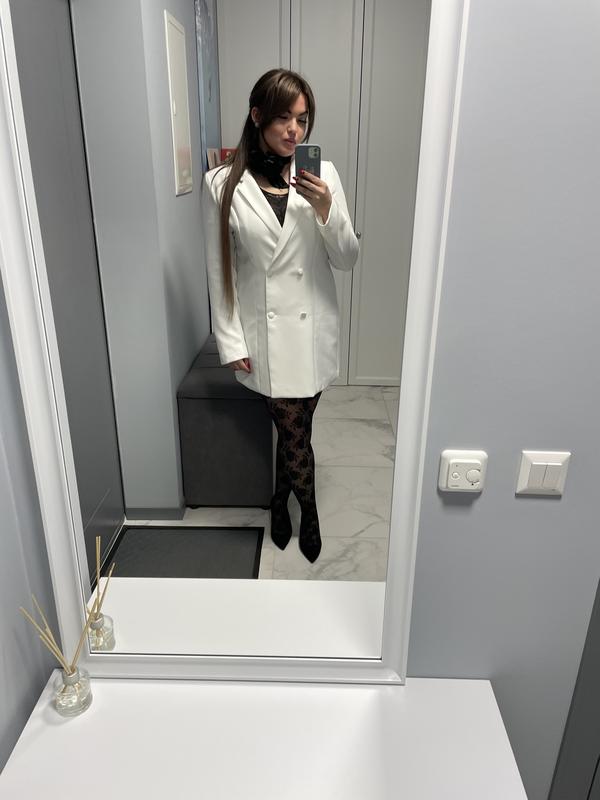 🥥 Белый удлиненный пиджак (можно носить как платье). 100% полиэстер. Достаточно легкая ткань. На подкладке. Не тянется. Размер L, лучше на М. Длина 85 см. Длина рукава от плеча 63 см. Ширина плечей 43 см. Полуобхват груди 50 см. Полуобхват талии 45 см. Напівобхват бедер 57 см. Стан идеален. Цена 640 грн.
