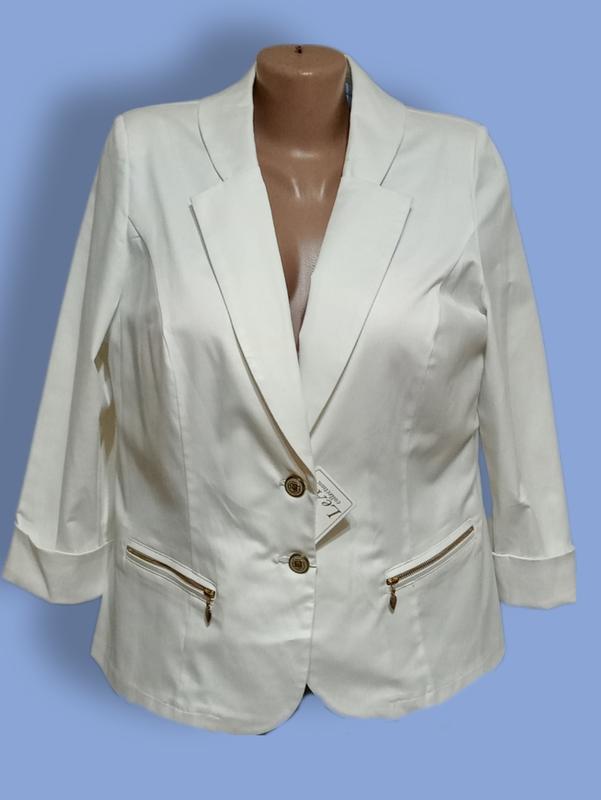 Жакет – универсальная женская одежда, которая выглядит в меру строго и в меру торжественно. Женские жакеты сочетаются с платьями, юбками и брюками классического или casual-стиля. Их можно носить и в офис, и каждый день и на торжественные праздники. Жакет белого цвета, приталенного силуэта, длина модели до бедер. V- образная горловина с лацканами Впереди и сзади по всей длине рельефные выточки.. Рукав длина 7/8.. Карманы врезные на змейке не функционалы. Жакет без подкладки. Материал- средней плотности хорошо держит форму. Размер 58. Вещь новая это не сток. Цена вас приятно удивит, намного ниже рыночной. Основные замеры: Обхват груди-122см Обхват талии-108см Обхват бедер-126см Длина изделия-63см. Ширина спины-45см. Длина рукава -49см Обхват рукава по пройме вверху-40см. Обхват рукава внизу-32см. Длина лацкана-34см Длина кармана-змейки-12.5см. Смотрите мои другие объявления. Подписывайтесь. Приятных покупок.