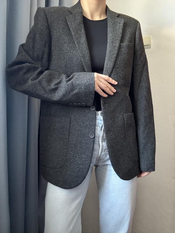 Шерстяной серый пиджак Asos 100% шерсть Стан - идеальный Размер M-L Замеры: плечи-44 см, рукав-66 см, полуобхват груди-53 см, длина-72 см. Одето на размер S