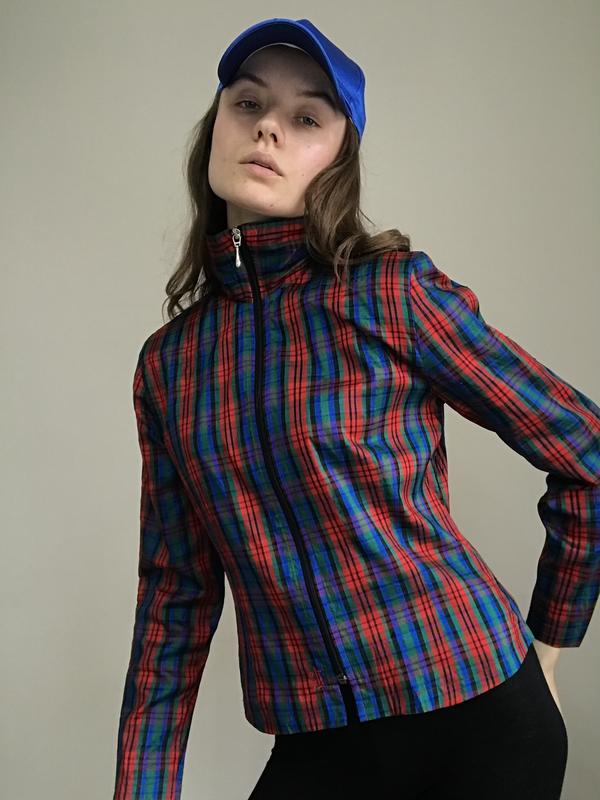 100% шелк. стильная ветровка в клетку на молнии шелковая жакет женский