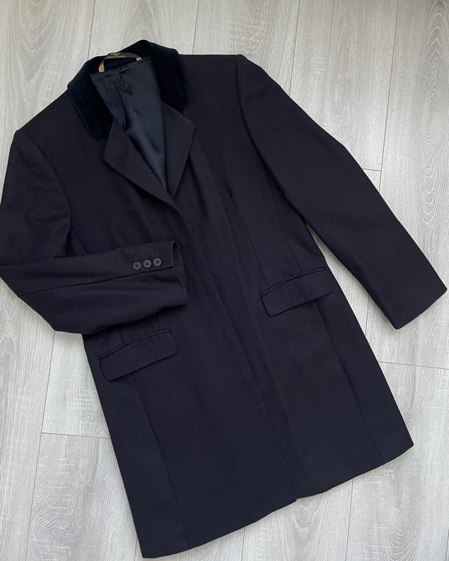 Идеальное состояние, размер с-м. 100% шерсть. Бархатный воротник, на пуговицах которые спрятаны. Цвет темно синий, камера передает более черный цвет.