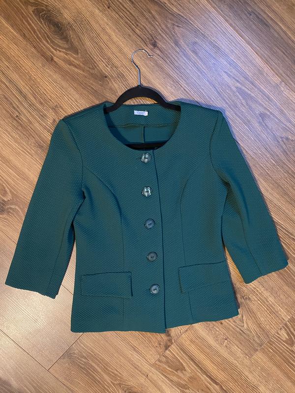 Жакет классический без воротничка и подкладки Имеет небольшие скрытые подплечники В стиле 60х Имеет одну небольшую заточку (фото последнее) Карманы декоративные Тканина трошки тягнеться Полуобхват груди - 42 см Длина от плечевого шва - 57 см Пол обхват рукава - 14 см
