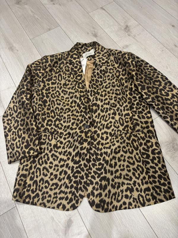 Новый пиджак в актуальный лео принт. Размер S/M, но может быть и на небольшой L. Состав полиэстер. Параметры: плечи 43см, рукав 56см, ПОГ 54см,ПОБ 56см, длина 72см. Имеют небольшой подплечник.