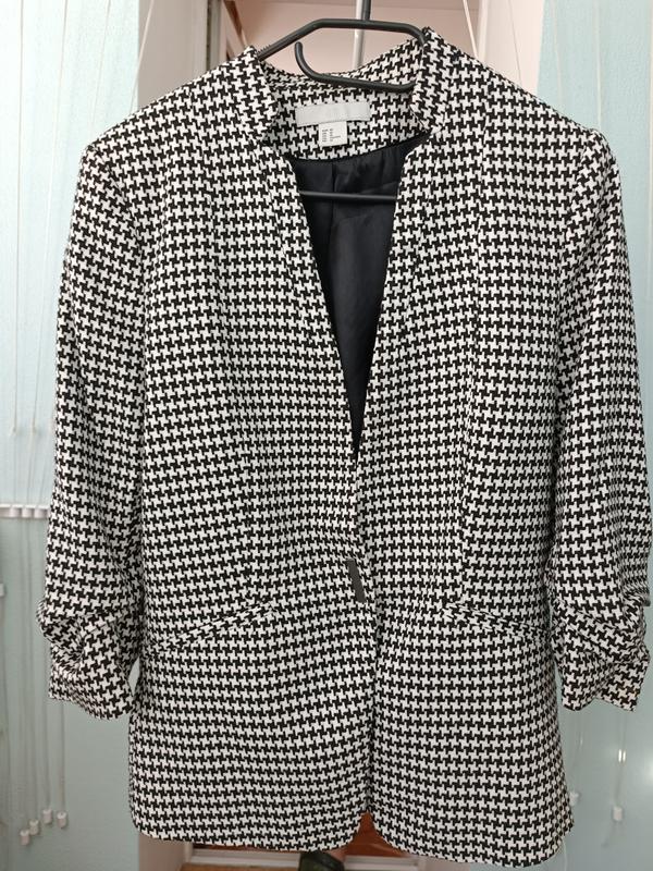 Жакет в гусинку лапку черно-белого цвета в идеальном состоянии. Размер 40. Рукав 3/4 присборенный красиво. Состав: вискоза-48%, полиэстер-12%. Длина по спинке-63. ПОГ-47, ПОТ-42, ПОБ-48.