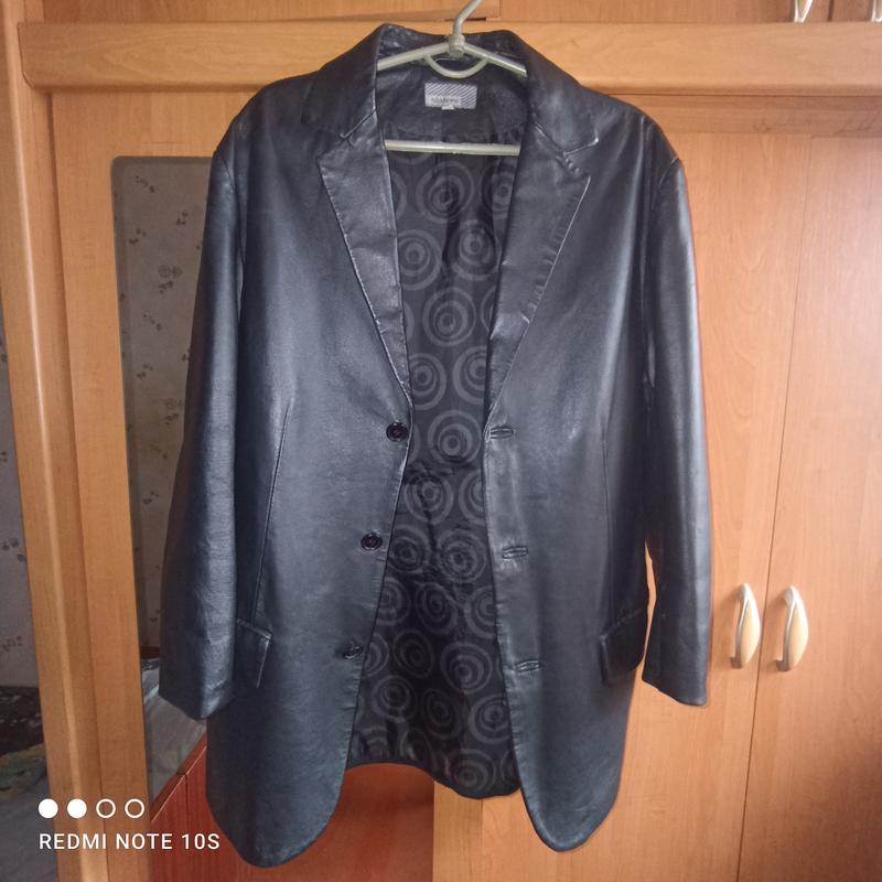 натуральная кожа. кожа не мягкая, поэтому хорошо держит форму. классическая модель. грудь 50 см. бедра 53. плечи 47см. рукав 56 см. длина 78 см.