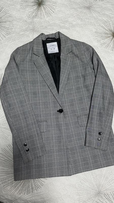 Пиджак прямого кроя, слегка овер. Приятный материал, не мнется. Состояние нового, один раз одела будучи беременной. Размер S, можно XS будет более объемный.