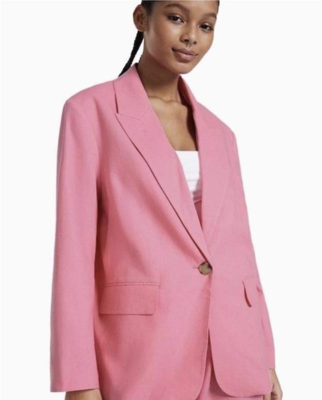 Класний блейзер від Bershka із сумішового льону у стилі Барбі, зовсім не парить, стильна і зручна модель Є в наявності у розмірах S, M, L розмір S прийшов з невеличким нюансом ( на лацкані є полосочка ніби від шарикової ручки-видно на останньому фото, тому продається з 30% знижкою розмір M, L-1450 Блейзер планомірний, орієнтуйтесь по розмірам S:ширина-54,довжина-73,рукав-58 нюанс 30% знижка M:ширина-56,довжина-73,рукав-58 L:ширина-59,довжина-73, рукав-58