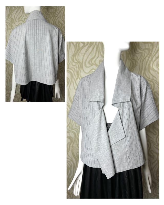 Сірий жакет Розмір універсальний Довжина по середині спинки 61см Плечовий шов відсутній,довжина рукава від шиї 45см