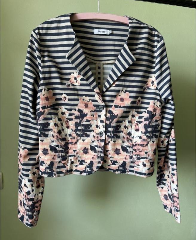 Красивий принт. Стан ідеальний . Склад тканини на фото Шикарний піджак Myrine L/XL Дуже крутій принт. Стильний, зручний, можна багато з чим комбінувати. Пог 52см Плечі 41см Рукави 64см Довжина 54см