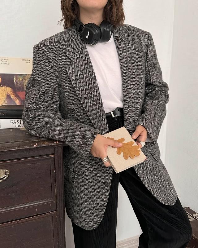 Шикарный серо-чёрный пиджак из шерсти в елочку. Застёгивается на две пуговицы. Сделан из 100% шерсти . Размер не указан, примерно S-M. Ориентируйтесь на замеры : длина- 80 см, рукав- 63 см, плечи по спине- 43 см, грудь полу обхват-52.5 см, полу обхват низа -53 см, но за счет разреза сзади и скругления спереди можно больше