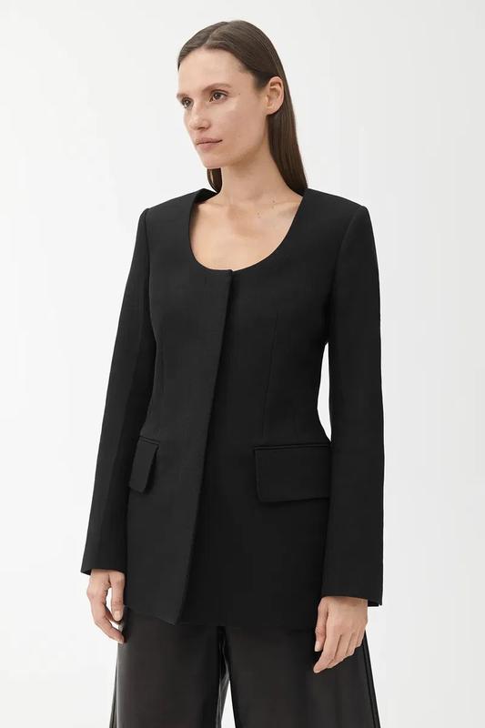 Зітканий з чистої бавовни, цей піджак має приталений крій. Він виконаний без коміра, з округлим вирізом, прихованою застібкою спереду та двома кишенями. Розмір S. Тканина бавовна