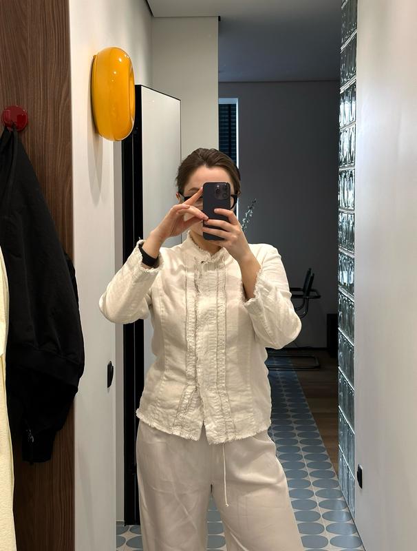 Лляний жакет з елементами цікавої деконструції. Приховані ґудзики класно пришиті хрестиками 🌚 • Тканина: 100% льон. • Приталений крій, є виточки✨ • Розмір на етикетці стерся, але найкраще буде S. • Стан: ідеальний. Заміри: • Напівобхват грудей: 52 см. • Напівобхват талії: 46 см. • Довжина по спинці: 60 см. • Довжина рукава від горловини: 64 см. Фото на мені є в галереї. • Мій зріст: 166 см (маю досить довгі руки 😜). • Розмір верхнього одягу: М. Якщо знадобляться додаткові заміри виробу, пишіть.