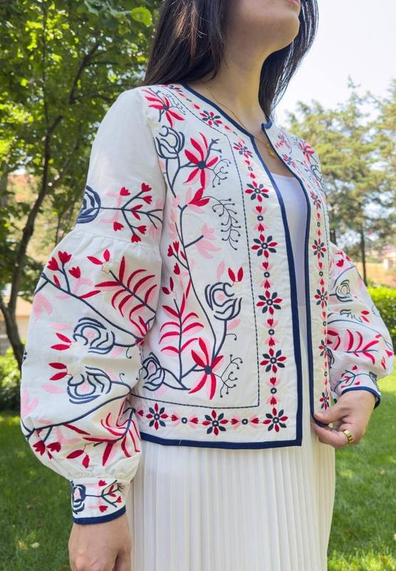 Новинка !!! #жакет с вышивкой Размер: s,m, L Состав: 80% хлопок+20% полиэстр Турция Замеры: Полуобхват груди по изделию: S-48 см, М-50см, L-52 см Длина изделия: S-52 см, М-52 см, L-52 см Длина рукава от горловины: S-63 см, М- 64см, L-65 см