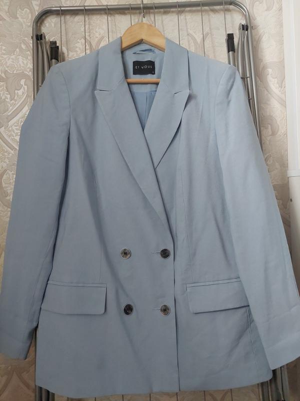 Двубортный пиджак красивого голубого цвета, покупала на эфире в тиктоке для себя, но оказался в бедрах и руках не большим( Поэтому на бедра до 106 см и не сильно пышные руки) Держит форму, только надо хорошо отпарить На подкладе Имеет карманы Груди 48 см Длина 72 см Всегда можно заказать безопасной доставкой и примерить За сколько взяла, за столько же продаю