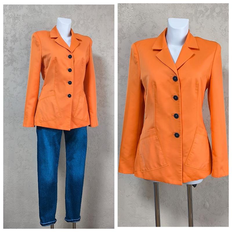 Винтажный пиджак Versus Jiani Versace с пуговицами с логотипом, оранжевого цвета. Строгие линии модели компенсируют особенность используемой костюмной ткани с характерной фактурой. Два накладных кармана по бокам, четкая линия плеч обеспечивают мягкие вставки. Застегивается на крупные пуговицы, на подкладке. Хорошее качество, редкий и стильный. '💫Размер: S 💫Состояние: идеальный 💫Состав: бирочки со складом срезанные 💫длина спинка 69, плечи 40 ПОГ 46, ПОТ 40, ПОС 48 рукав 60 Versus (Versace) была диффузионной линией итальянского дома моды класса люкс Versace. Его основал в 1989 году Джанни Версаче в качестве подарка своей сестре Донателли.