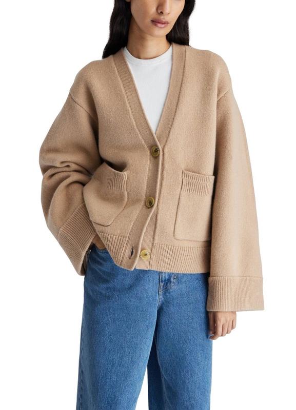 Цей вовняний кардиган Axel Arigato має в'язану конструкцію, V-подібний виріз горловини, застібку на ґудзики спереду, занижені плечі, довгі широкі рукави, дві накладні кишені спереду, вишитий логотип спереду та ребристі манжети та поділ. Бренд: Аксель Арігато МАТЕРІАЛ: 100% вовна КОЛІР: верблюжий_бежевий Доступний розмір XS