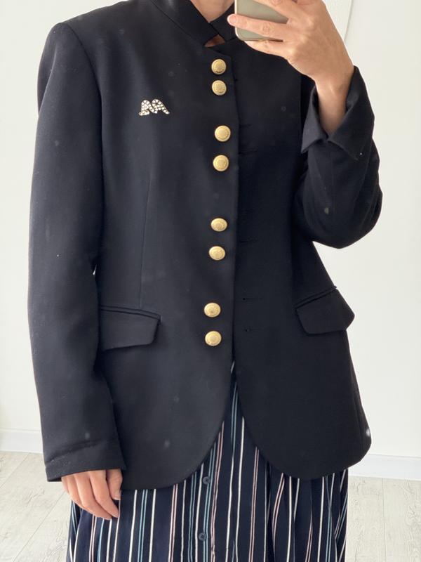 Піджак чорний вовняний жакет з золотими гудзиками і вишивкою з каменів сваровскі, дуже гарно переливаються.Вовна лами 35 % 🦙, 30 % віскоза та поліестер-хороший склад. Довжина 70 см, ПОГ 49 см, плечі з підплічниками , дуже гарно виділені 40-42см, рукав має гарний закот з розпіркою , в нерозкоченому вигляді 59 см, стан нової речі дуже дорогого Італійського бренду