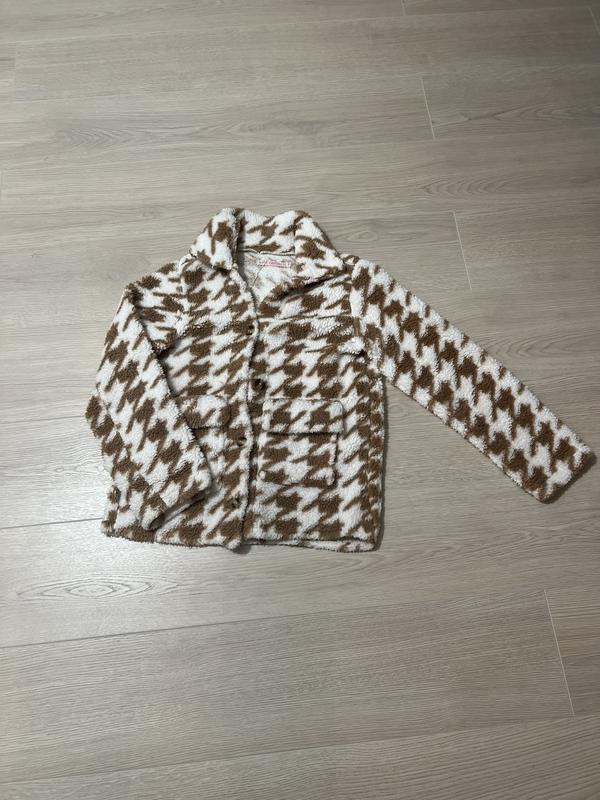 Стильна та затишна куртка-жакет із м’якого ворсистого матеріалу у класичному візерунку «гусина лапка». Легко поєднується з джинсами, брюками чи спідницею, створюючи яскравий акцент у повсякденному образі. Характеристики: • Колір: коричнево-білий • Принт: «гусина лапка» (великий орнамент) • Фасон: прямий, вільний крій • Матеріал: штучне хутро / м’який ворсистий текстиль • Застібка: ґудзики спереду • Кишені: дві накладні кишені спереду • Рукав: довгий, класичний • Довжина: до стегон • Сезонність: осінь / весна