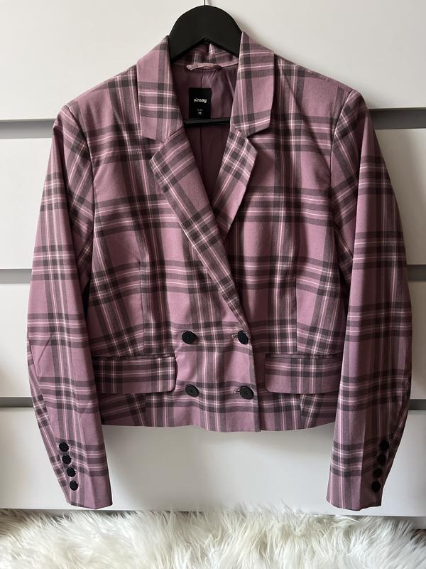 Короткий піджак в клітинку бренда Sinsay у розмірі М Напівобʼєм грудей: 49 см Напівобʼєм талії: 49 см Довжина виробу: 55 см Довжина рукава: 48 см