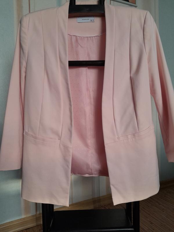 жакет без застежки нежного розового цвета пригодится осеннему дню полуобъем груди 49 см полуобъем талии 46 см длина 65 см длина рукава 52 см присутствуют карманы, плечи уплотнены небольшим подплечником, держат форму