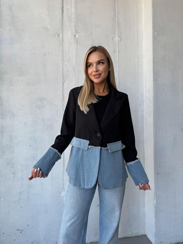 901 Піджак Розмір : 42-48 універсал Склад: костюмка+денім Заміри: Загальна довжина: 70 см Обхват грудей: від 90 см до 105 см Довжина рукава: 70 см. Якість : супер Виробник: Фабричний Китай