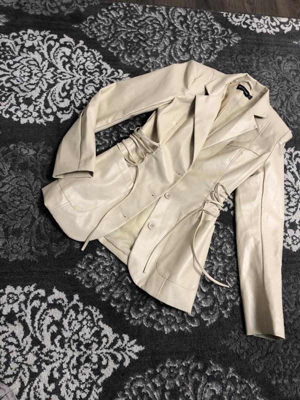 Піджак з екошкіри,стан нового.Розмір хс,с ( заміри в приват при потребі) має дефект ( див фото) плями на спині