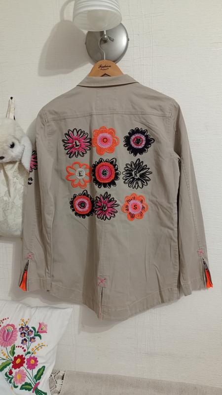 В состоянии новой вещи. Дууже интересный и прикольный. Спереди асимметричная вышивка, обратите внимание: воротник, карман верхний и два кармана нижний. Цветок на рукаве и на нижнем кармане. А спинка – вообще цветущий сад) Фурнитура брендированная, показала на фото. Размер - 36, S, но может и М. Плечи - 40, подмышками - 50, талия - 49, рукав - 59. Безупречное состояние!